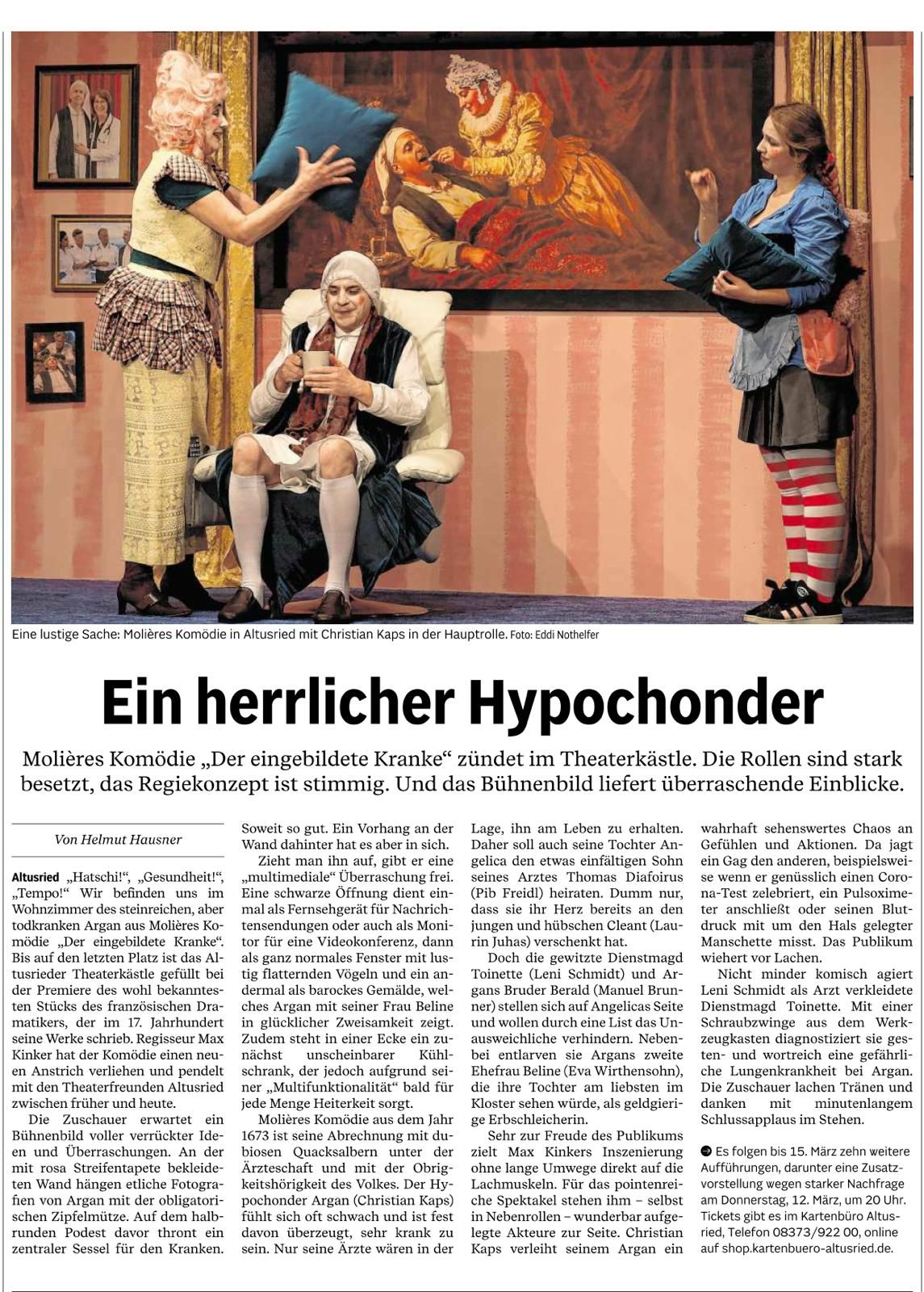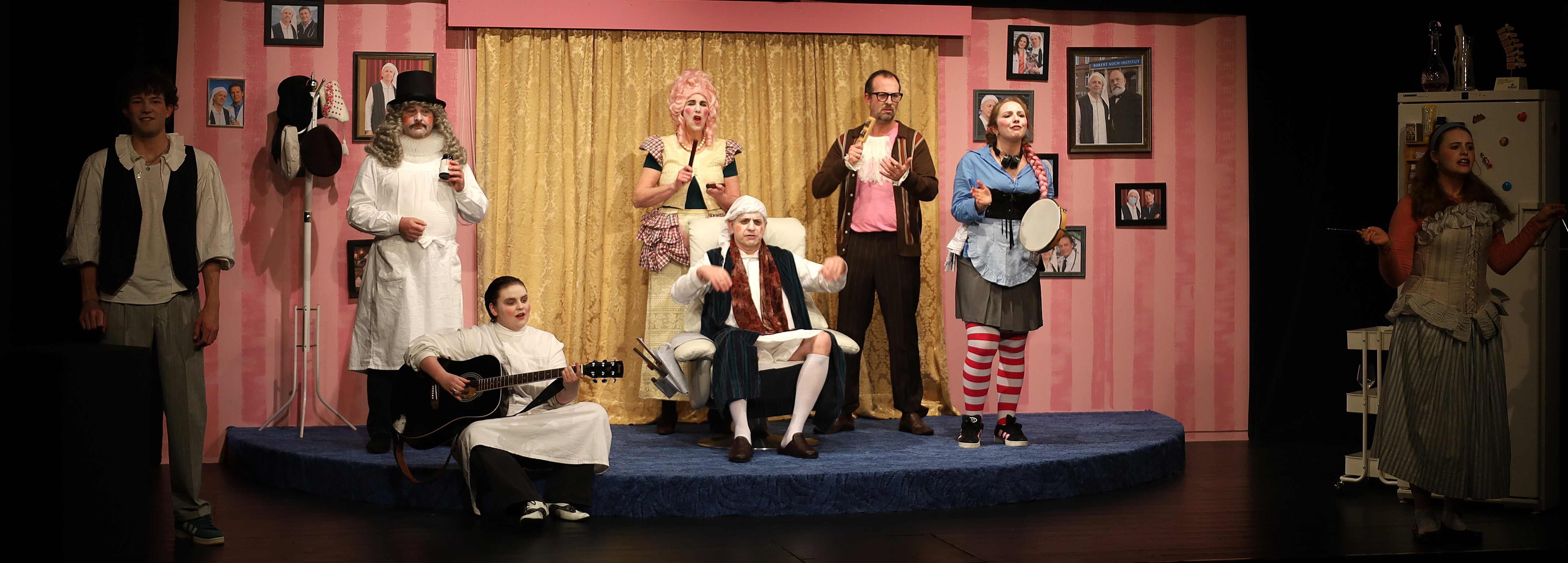 Max Kinker legt den Fokus auf die modernen Seiten dieses Komödienklassikers und zeigt, wie aktuell Molières Themen auch heute, 350 Jahre später, noch sind: Hypochondrie im Zeitalter von Dr. Google und Selbstdiagnose – hat sich wirklich so viel geändert seit Molières Zeiten? Gesundheitswahn und die Sehnsucht nach Aufmerksamkeit – alles keine Erfindungen der Neuzeit! Mit viel Humor und Gespür für die Absurditäten des Alltags bauen die Theaterfreunde Brücken zwischen dem 17. Jahrhundert und der Gegenwart, in der die Selbstoptimierung ein lukrativer Geschäftszweig geworden ist.